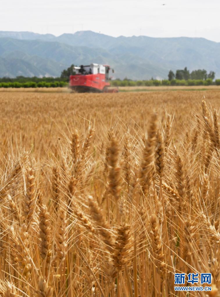 5月22日,收割机在运城市盐湖区银张村的麦田里作业。
