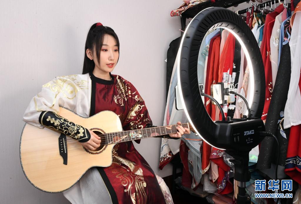5月22日,邓寓君在家中进行国风音乐直播。新华社记者 任超 摄