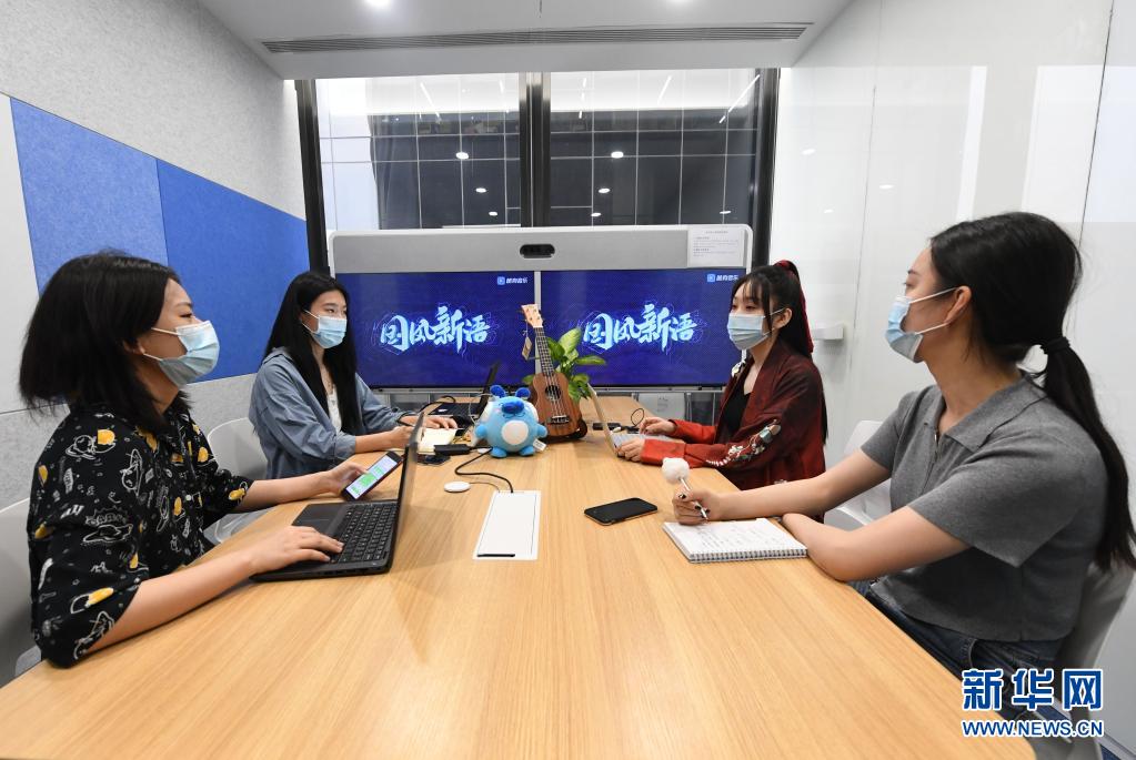 5月22日,邓寓君(右二)在工作室与团队工作人员讨论国风音乐创作。新华社记者 任超 摄