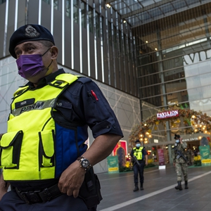5月22日,戴着口罩的行人走在马来西亚吉隆坡街头。