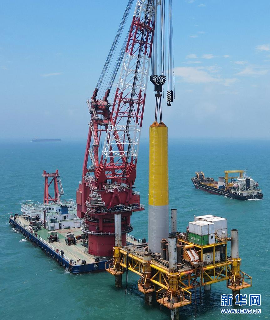 中交一航局海上施工人员在进行海上风电大直径嵌岩单桩施工作业(5月21日摄,无人机照片)。