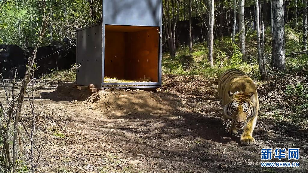 5月18日,在黑龙江省穆棱林业局有限公司林场,之前在密山市获得成功救护的野生东北虎从铁箱子里走出,回归自然(视频截图)。专家表示,这是我国首次成功救护并放归野生东北虎。