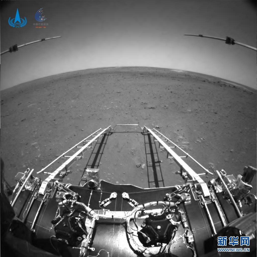 5月19日,国家航天局发布我国首次火星探测天问一号任务探测器着陆过程两器分离和着陆后火星车拍摄的影像,该图由火星车前避障相机拍摄,正对火星车前进方向。图像中,着陆平台和“祝融号”火星车的驶离坡道、太阳翼、天线等机构展开正常到位。