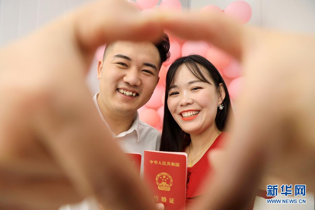 5月20日,在安徽省淮北市相山区政务服务中心婚姻登记大厅,一对新人在领证后拍照留念。因“520”与“我爱你”谐音,很多新人选择在5月20日这一天登记结婚,让这美好的日子见证爱情。