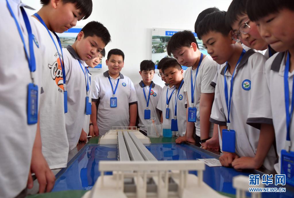 5月22日,在沙河渡槽全国中小学生研学实践教育基地,河南宝丰县第二初级中学学生观察渡槽模型。