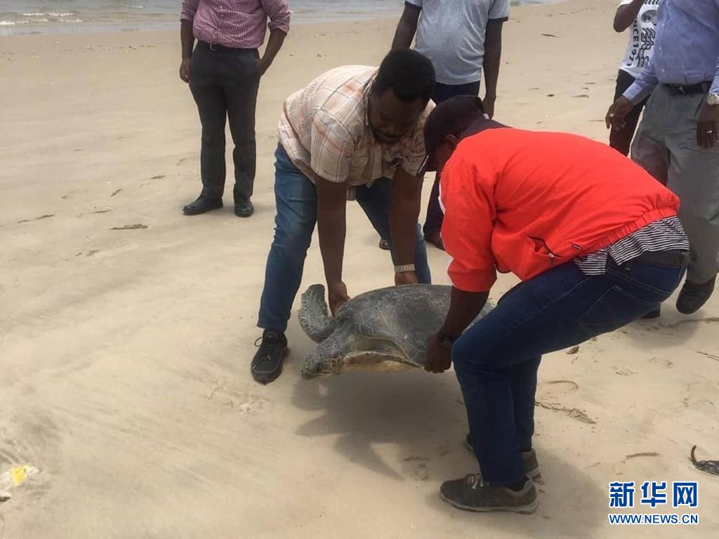 5月17日,人们在尼日利亚拉各斯市一处海滩释放一只海龟。