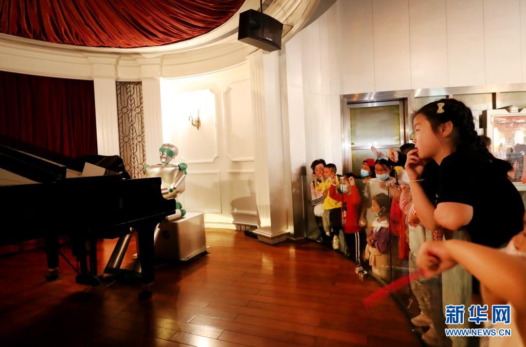 5月23日,小朋友们在欣赏机器人弹钢琴。