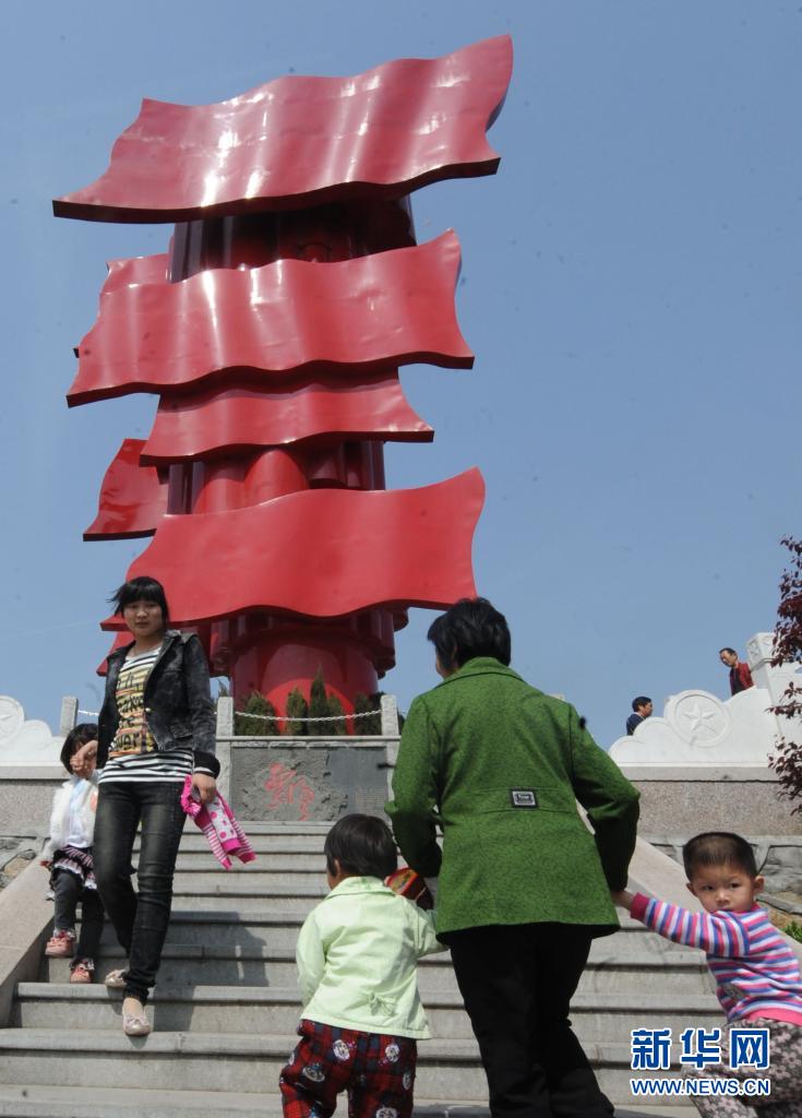 游客在鄂豫皖苏区首府革命博物馆附近的英雄山,参观“红旗飘飘”主题雕塑(2011年4月24日摄)。新华社记者 王颂 摄