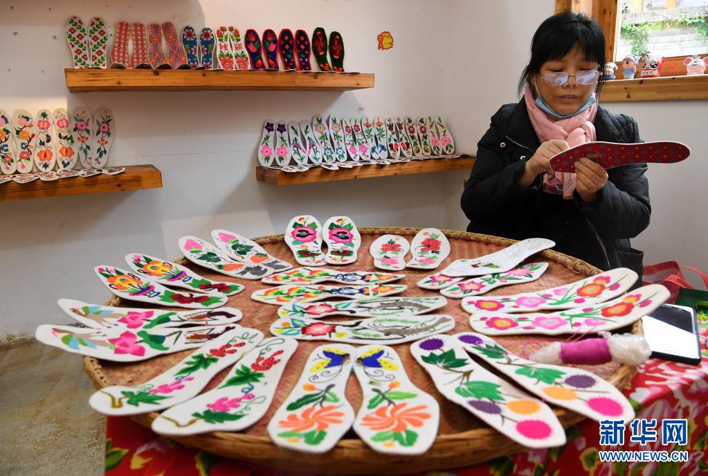 在河南省信阳市新县田铺大塆,一位村民在缝制鞋垫(2020年3月27日摄)。新华社记者李安摄