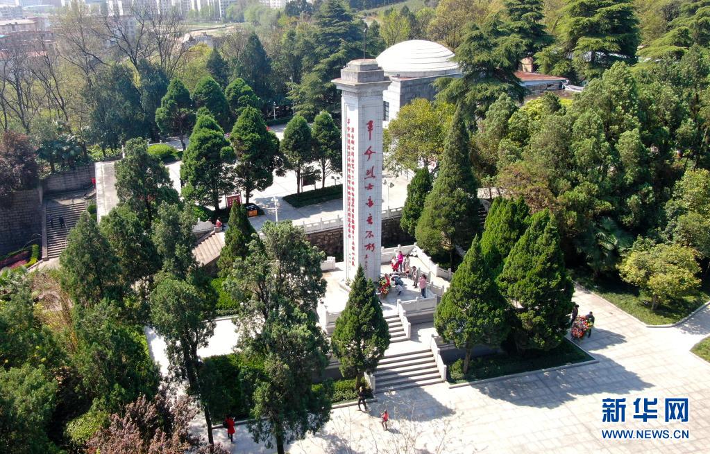 人们在鄂豫皖苏区首府烈士陵园革命烈士纪念碑前祭奠(2021年4月4日摄,无人机照片)。新华社记者 郝源 摄