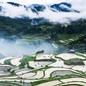 5月23日,贵州省黔东南苗族侗族自治州黎平县尚重镇上洋、下洋、岑埂等村的农民牵着耕牛来到岑丈梯田,参加“千牛同耕”活动,向游客展示当地传统农耕文化。 新华社记者 杨文斌 摄