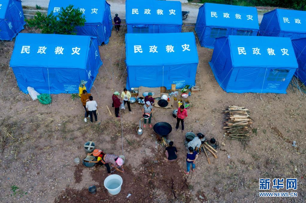 5月23日,在漾濞县苍山西镇秀岭村一处安置点,受灾村民准备做饭(无人机照片)。