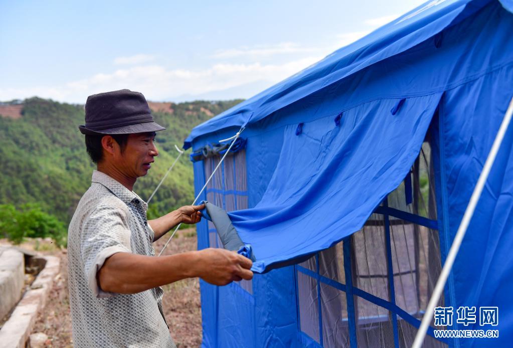 5月23日,在漾濞县苍山西镇秀岭村一处安置点,受灾村民对帐篷进行通风。