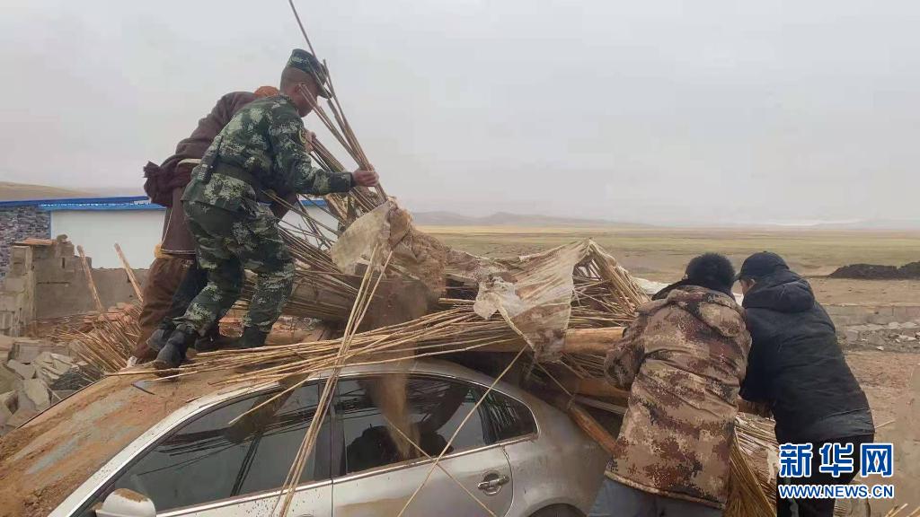 5月22日,武警青海总队果洛支队玛多中队官兵在玛多县花石峡镇斗纳村协助群众清理坍塌车棚(手机照片)。新华社发(宗君伟 摄)