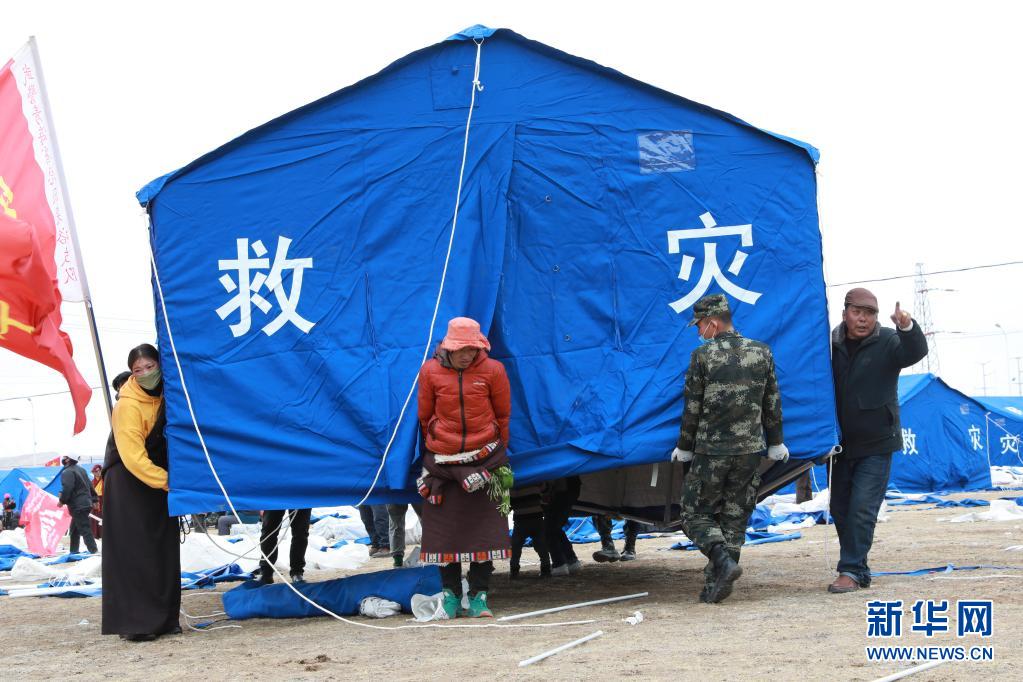 5月23日,武警青海总队果洛支队机动大队官兵在玛多县噶丹村临时安置点和受灾群众一起搬运帐篷。新华社记者 刘芳 摄