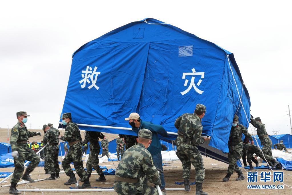 5月23日,武警青海总队果洛支队机动大队官兵在玛多县噶丹村临时安置点为受灾群众搭建帐篷。新华社记者 刘芳 摄