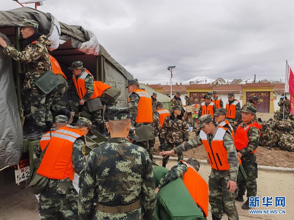 5月22日,武警青海总队果洛支队机动大队官兵在玛多县花石峡镇搬运救援物资(手机照片)。新华社发(宗君伟 摄)