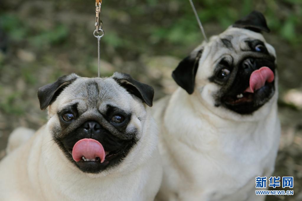 5月23日,两只巴哥犬在罗马尼亚首都布加勒斯特参加选美比赛。新华社发(克里斯泰尔摄)