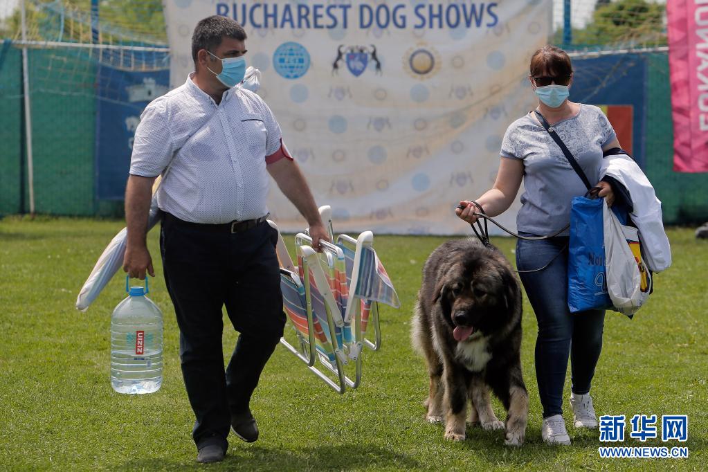 5月23日,一只宠物犬在罗马尼亚首都布加勒斯特参加选美比赛后随主人离开。新华社发(克里斯泰尔摄)