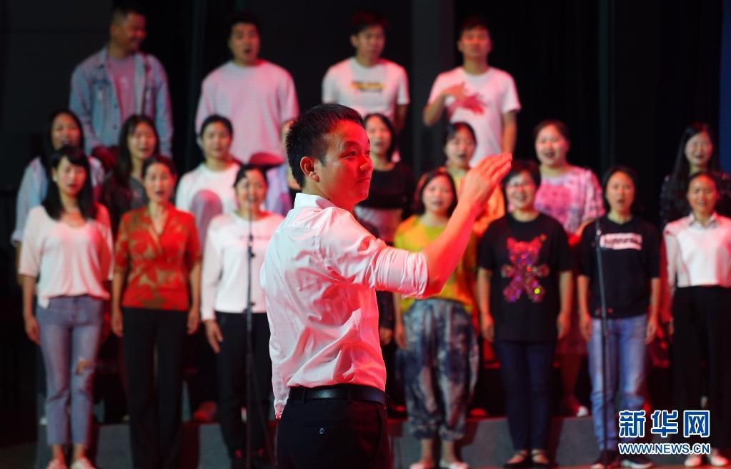 长征源合唱团艺术总监刘文力(前排)指挥团员们彩排(5月19日摄)。新华社记者 万象 摄