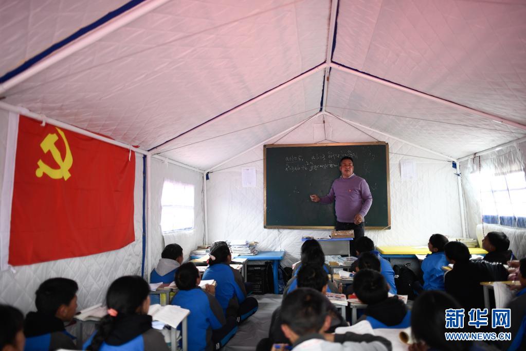 5月23日,李加才让在玛多县民族寄宿制中学帐篷教室里上课。