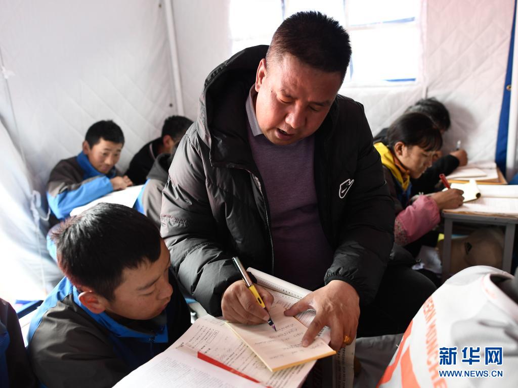 5月23日,李加才让在帐篷教室里给学生辅导功课。新华社记者 张龙 摄