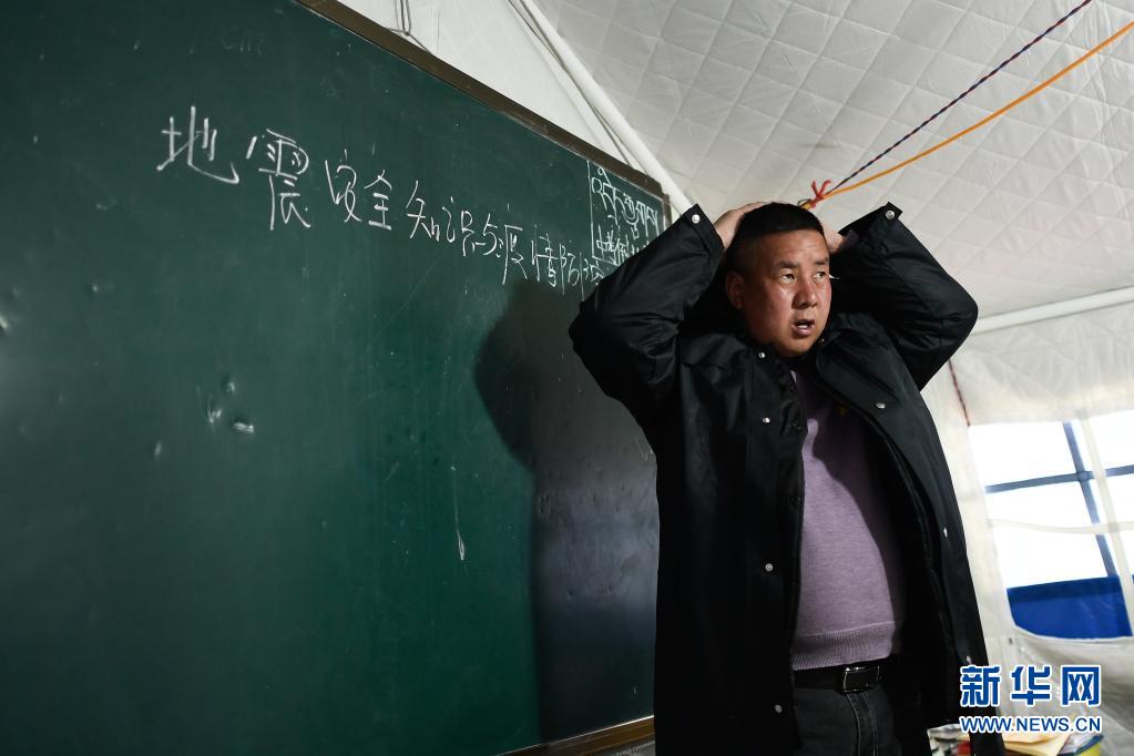 5月23日,李加才让在九年级二班的主题班会上讲解地震逃生知识。新华社记者 张龙 摄