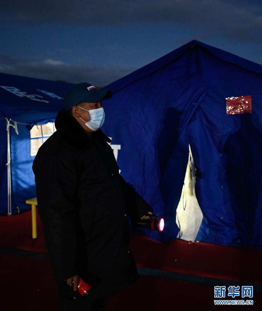 5月23日夜间,李加才让在玛多县民族寄宿制中学操场的学生营地巡查。新华社记者 张龙 摄