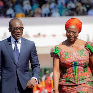5月23日,贝宁当选总统帕特里斯·塔隆在波多诺伏的夏尔·戴高乐体育场检阅军队。