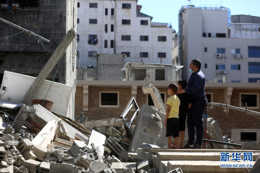 5月23日,巴勒斯坦人在加沙城望着遭以军空袭损毁的房屋。5月10日以来,以色列与加沙地带武装组织之间爆发严重冲突。20日晚,哈马斯与以色列方面各自宣布,双方已达成停火协议,停火从21日凌晨开始。新华社发(里泽克·阿卜杜勒·贾瓦德摄)