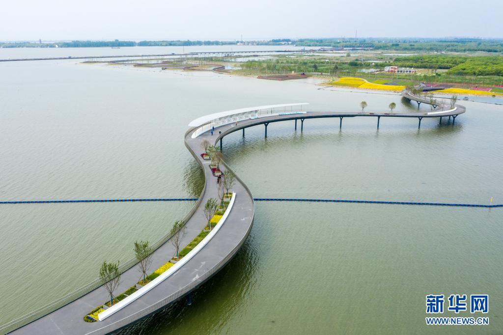 这是5月7日拍摄的位于江苏省苏州市吴江区连接江苏吴江和上海青浦的元荡慢行景观桥(无人机照片)。新华社记者 李博 摄