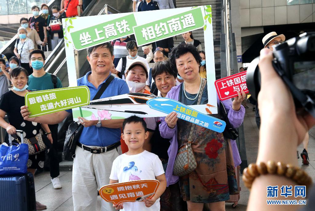 乘坐C3856次列车从上海经沪苏通铁路前往江苏南通的旅客在上海火车站合影留念(2020年9月12日摄)。新华社记者 陈飞 摄