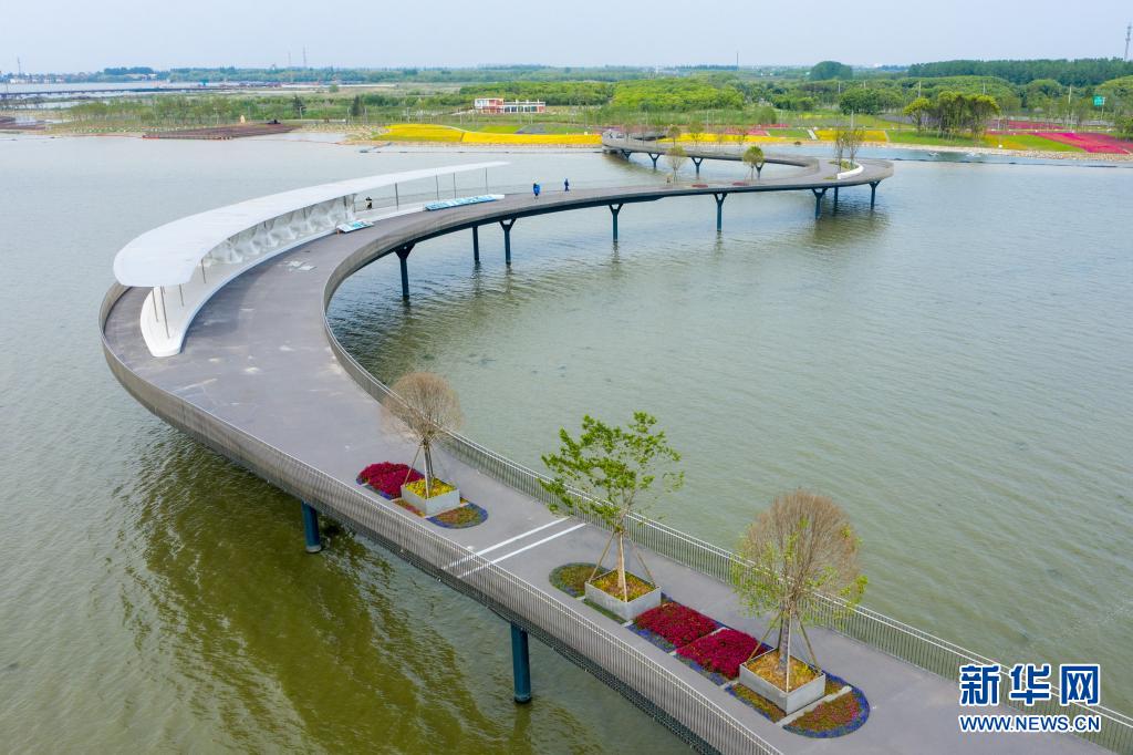 这是5月7日拍摄的位于江苏省苏州市吴江区连接江苏吴江和上海青浦的元荡慢行景观桥(无人机照片)。新华社记者 李博 摄