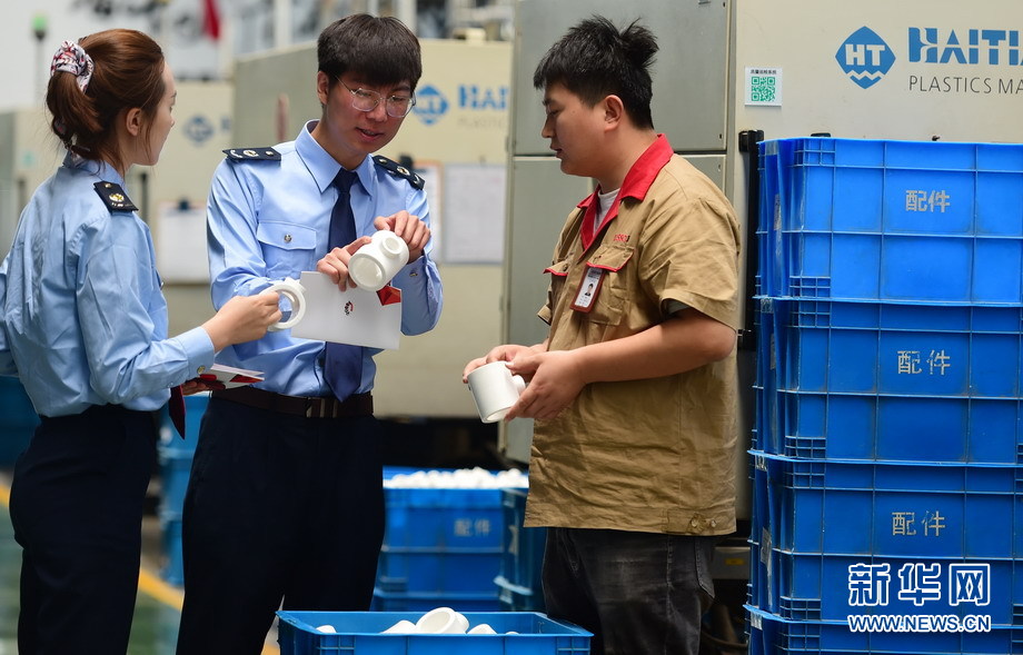 5月24日,任丘市税务局工作人员走访一家塑料管道生产企业,了解生产情况,宣讲有关环保税征收政策。新华网发(傅新春 摄)