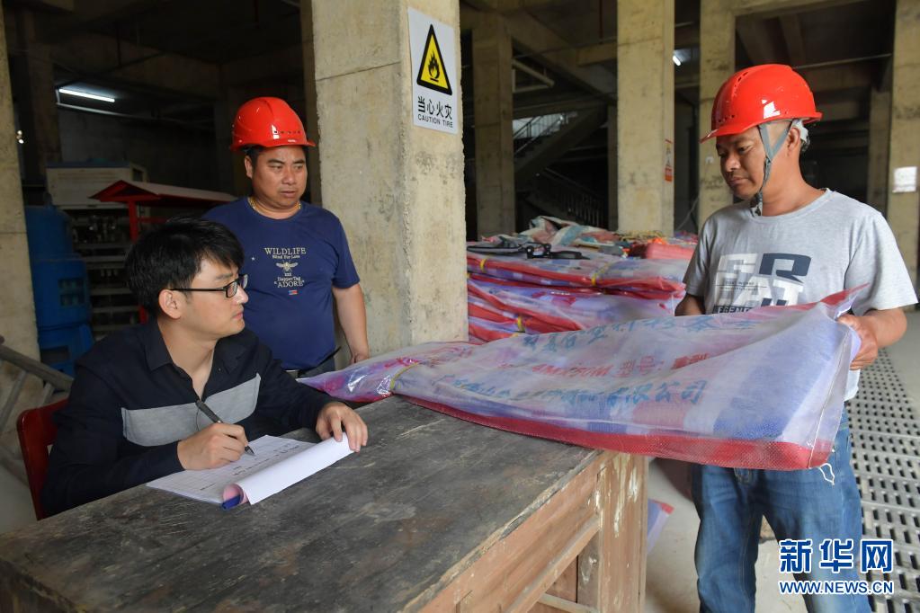 5月25日,在南昌县蒋巷镇西舍泵站附近的防汛物资储备点,工作人员清点储存的防汛物资。
