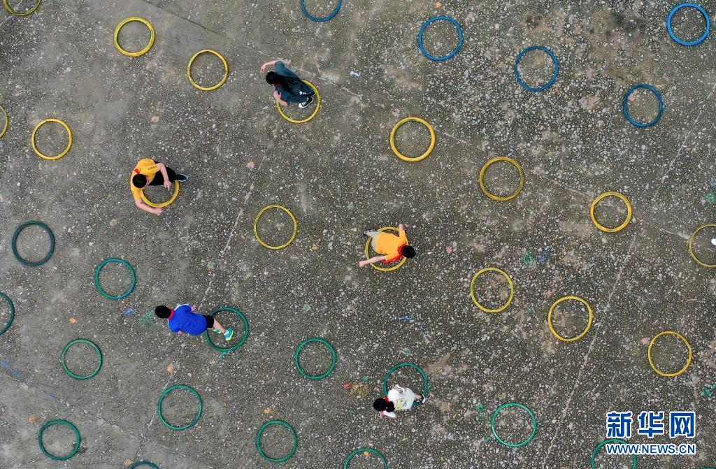5月25日,福建省泉州市永春县蓬壶镇仙岭小学的学生利用废旧轮胎胶圈在课间做游戏(无人机照片)。