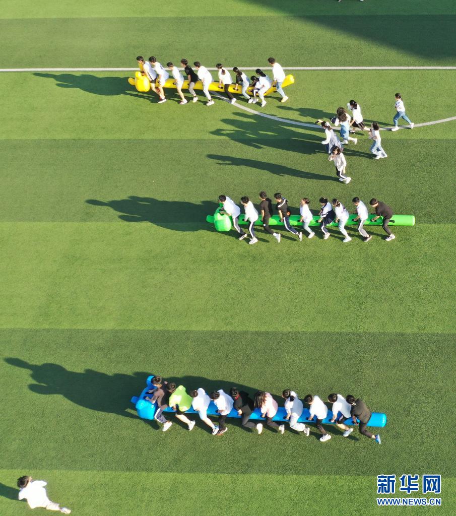 5月25日,湖南省永州市道县第一中学的高三学生在做“同舟共济”游戏(无人机照片)。