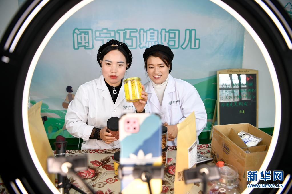 宁夏银川市永宁县闽宁镇闽宁禾美电商扶贫车间员工海燕(左)和马燕在直播带货(2020年11月11日摄)。新华社记者 冯开华 摄