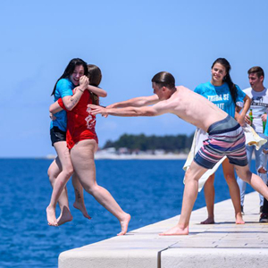 5月25日,克罗地亚的中学生在扎达尔的海边参加“疯狂日”活动,庆祝学年结束。