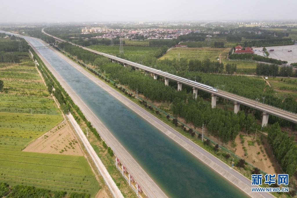 在河北省石家庄市正定县以北的于家庄村附近,南水北调中线干渠与京广高速铁路“不期而遇”(2021年5月24日摄,无人机照片)。