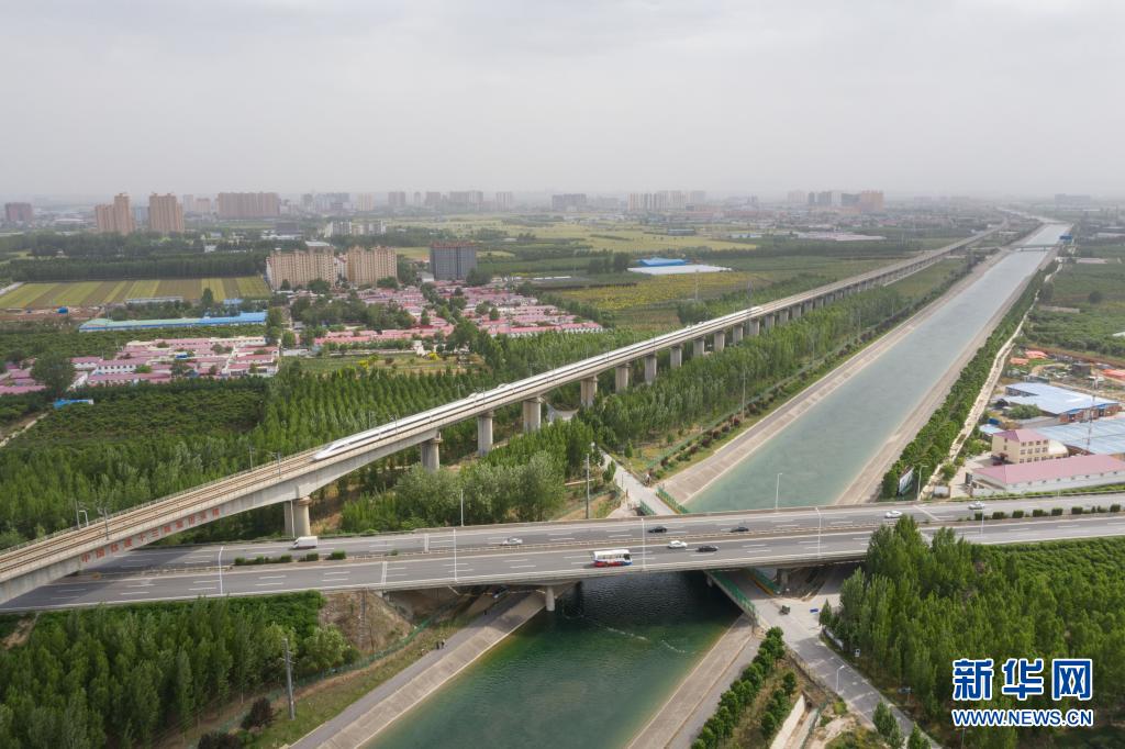 在河北省石家庄市正定县以北的于家庄村附近,南水北调中线干渠与高铁、公路交织(2021年5月24日摄,无人机照片)。