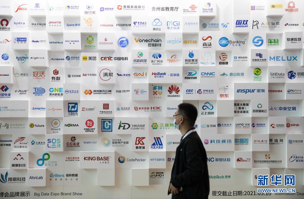 5月26日,在“数博会”现场,一名观众走过展商品牌墙。