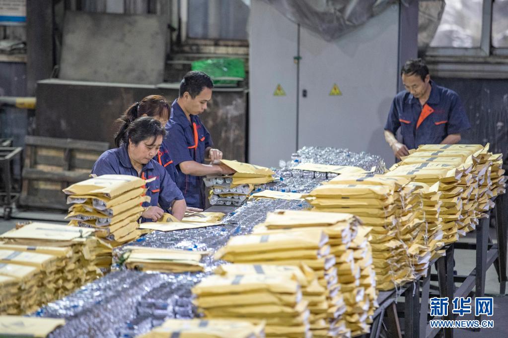 5月24日,在重庆润际远东公司生产车间内,工人对金属添加剂进行装袋封包。新华社记者 黄伟 摄