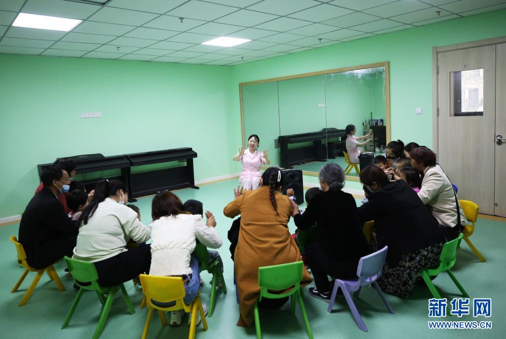 5月26日,在泗洪县康复护理院,特教老师(后)带领孩子进行音乐律动教学。
