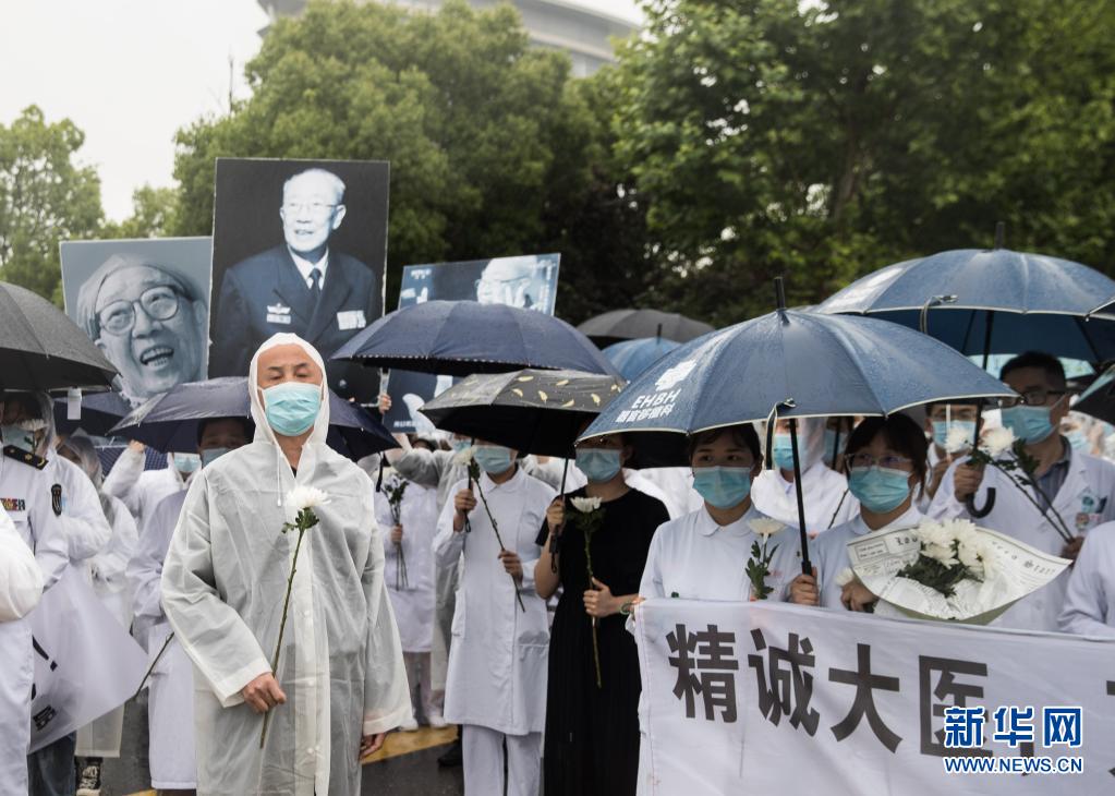 5月26日,载着吴孟超同志骨灰的灵车来到海军军医大学第三附属医院安亭院区,并绕行一周。医护人员目送灵车缓缓驶过。