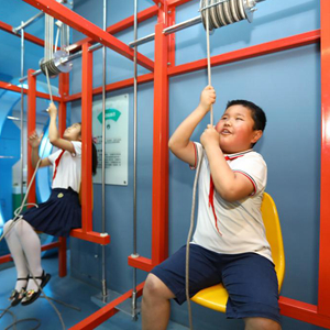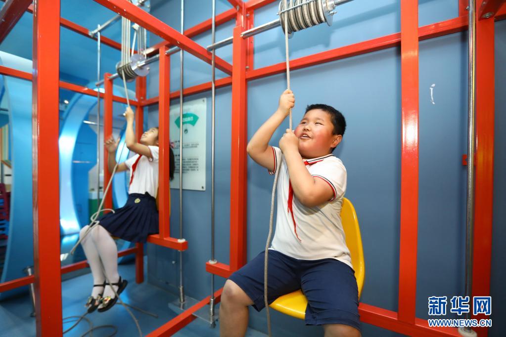 5月26日,淮北市古城路小学的学生在淮北市科技馆体验“自已拉自己”。