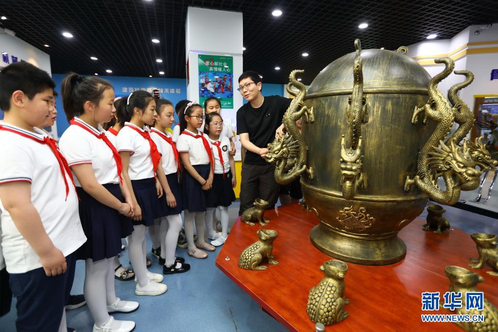 5月26日,淮北市科技馆的工作人员为淮北市古城路小学的学生讲解地动仪知识。新华社发(万善朝 摄)