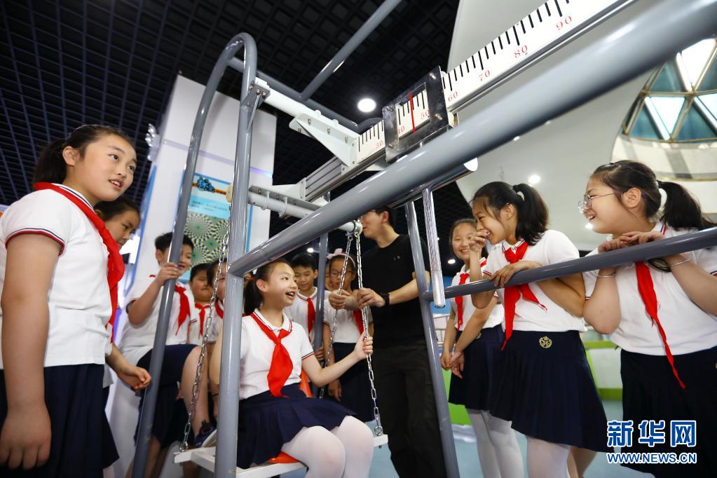 5月26日,淮北市古城路小学的学生在淮北市科技馆体验“大秤”。新华社发(万善朝 摄)
