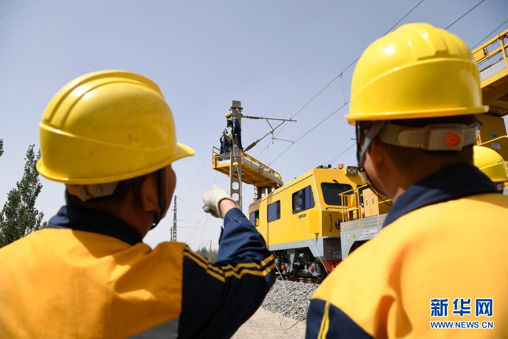 5月26日,中国铁路兰州局集团有限公司银川供电段工作人员在利用接触网作业车进行供电设备检修维护。新华社记者 王鹏 摄