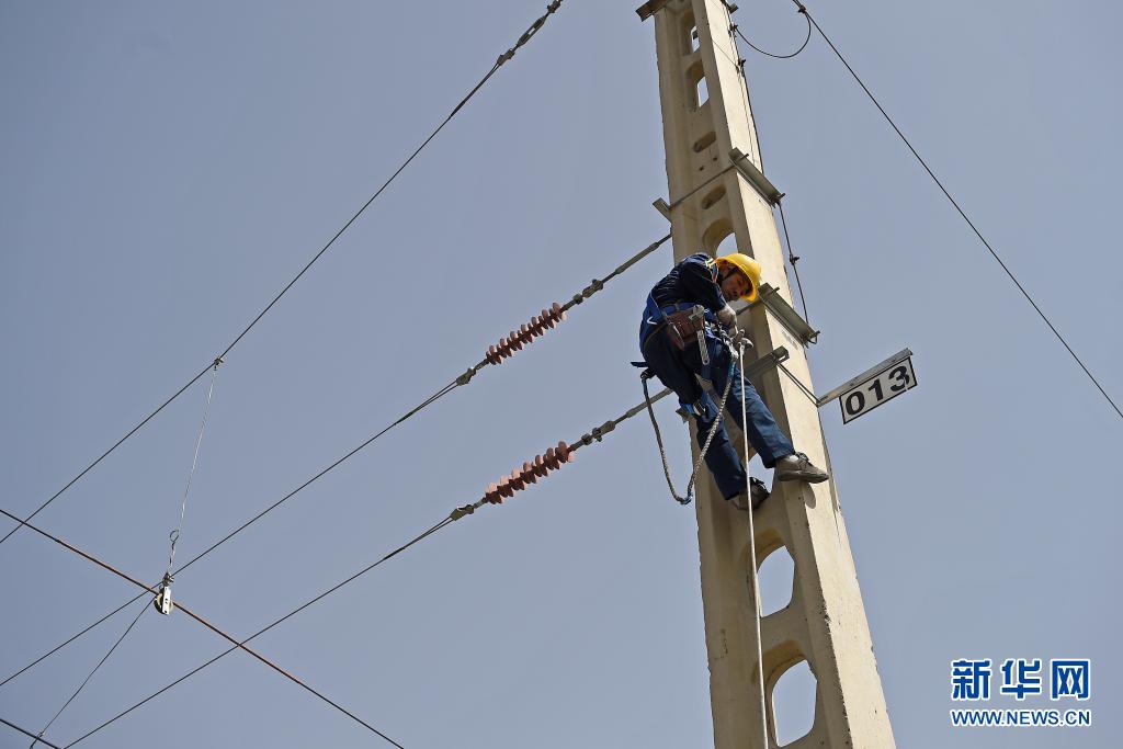 5月26日,中国铁路兰州局集团有限公司银川供电段工作人员在进行高空接触网维护作业。新华社记者 唐如峰 摄